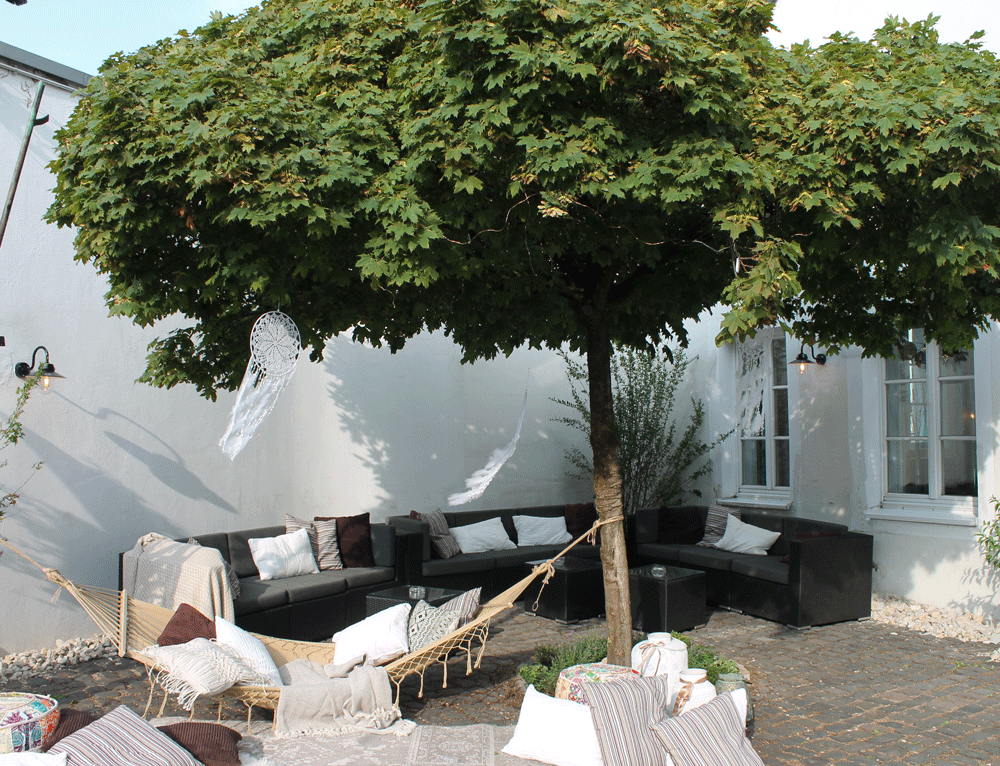Zu den Hofhaus Räumlichkeiten gehört außerdem ein schön gelegener Innenhof. Als Lounge mit dem passenden Mobiliar ist er der ideale Ort für einen Sektempfang.